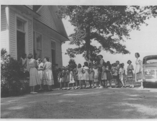 Rev. A. E. Cate was pastor in 1935 when an educational building was added to the white frame building. In December 1937 all debts on the building were paid in full.